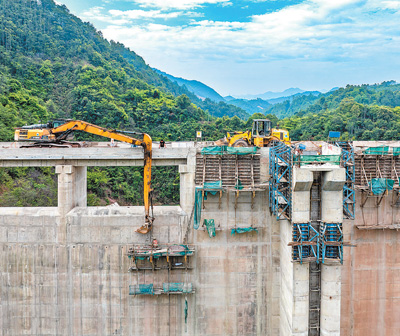 5月14日,位于广西梧州市蒙山县西河镇壬山村的壬山水库建设工地,工人正在加紧建设坝面相关设施。目前水库大坝主体工程已全面封顶,进入相关附属设施建设阶段,计划年底建成。