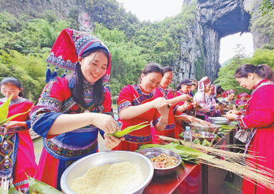 5月23日,在广西罗城仫佬族自治县怀群镇天门山景区,游客与村民参加包粽子比赛。
