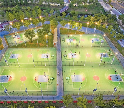 5月28日晚,江苏省泰州市体育公园灯火璀璨,市民在运动健身。
