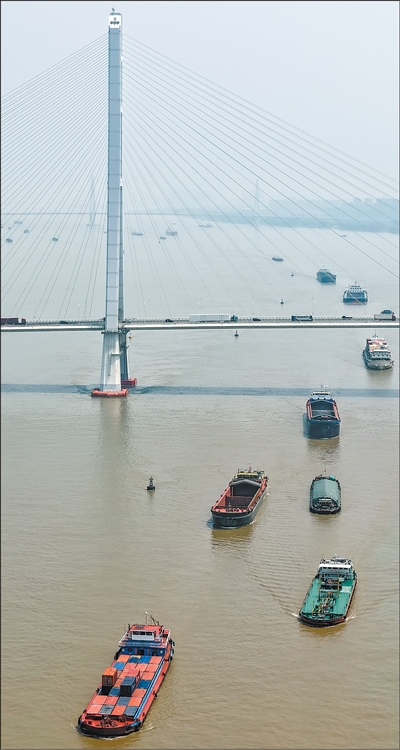 6月3日,江苏南京,一艘艘货船在长江航道上往来穿梭。