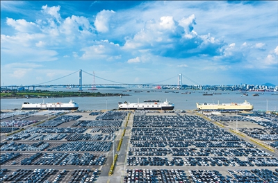6月10日,位于珠江入海口的广州港南沙汽车码头,各类汽车整齐排列,等待装船出海。