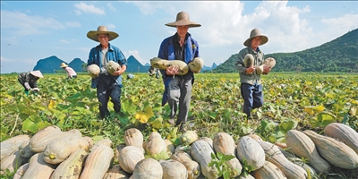 广西融水苗族自治县永乐镇北高村,村民在采收南瓜。