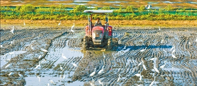 近年来,安徽省芜湖市繁昌区坚持以生态优先、绿色发展为导向,推动农业发展、农民增收,打造特色田园乡村。图为6月17日,在繁昌区平铺镇新塘村,农民驾驶拖拉机翻耕农田,白鹭在翻耕后的农田里觅食,与农机、农田构成了美丽和谐的生态田园画卷。