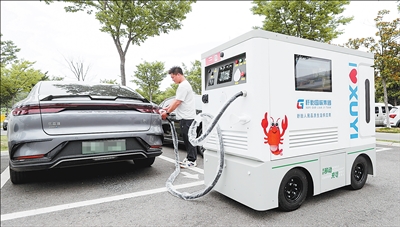 江苏淮安盱眙县,游客在公共停车场用移动充电设备充电。
