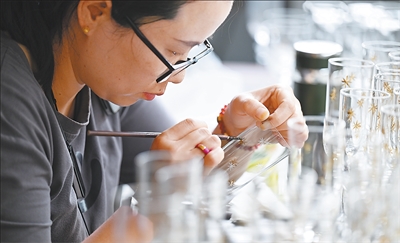 山西省祁县一家制造玻璃器皿的公司,工作人员在器皿上描绘图案。