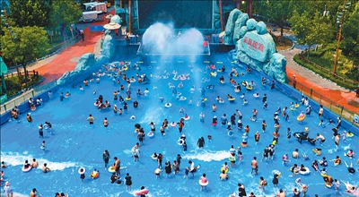 图为7月12日,市民游客在天津滨海新区方特水上乐园戏水纳凉。