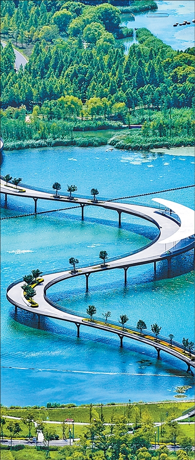 元荡位于上海、江苏交界处,两地联合实施跨界水体一体化管护项目,探索跨界水体共保联治经验,保护生态环境。图为7月19日,上海青浦区元荡慢行桥沿线呈现一幅水清、岸绿的美丽画卷。