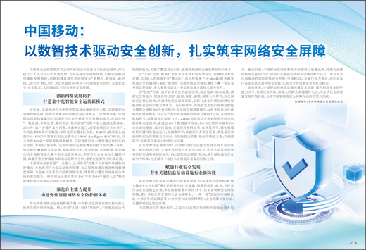 中国移动全面贯彻落实全国网络安全和信息化工作会议精神,深入践行以人民为中心的发展思想,立足基础电信网络优势,以新安全格局保障新发展格局,创新构建基础电信网络安全“新模式、新体系、新防线”,努力为10亿用户、3亿家庭提供7×24小时网络安全防护,为国家安全、社会稳定、人民福祉筑牢坚实网络安全屏障。
