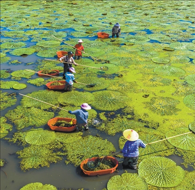 8月7日,安徽省合肥市庐江县白湖镇青帘村,农民在芡实田里进行除杂作业。当日是立秋,当地积极开展抢收抢种、农作物田间管理等农事活动。