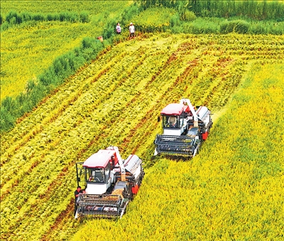 8月9日,重庆市梁平区星桥镇两路村,收割机在稻田中收割水稻。近年来,梁平区在星桥镇建设10万亩级高标准农田示范区,把一块块“望天田”改造成高产田。