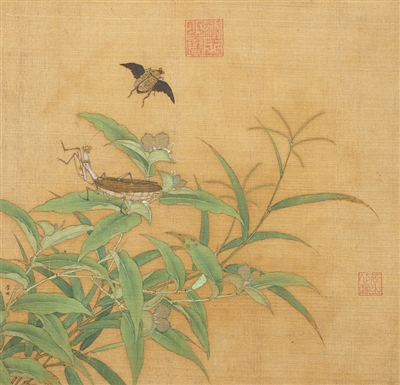 早在先秦时期的青铜器上,便可见昆虫纹饰。南北朝至五代,越来越多画家以昆虫入画。现存五代黄筌《写生珍禽图》,便对中华剑角蝗、黑蚱蝉、胡蜂等夏末秋初常见的昆虫进行了精妙刻画。画面上,昆虫富有弹性的触须、轻薄透明的羽翼等,显示了画家极强的洞察力与艺术表现力。