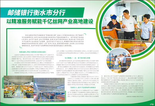 邮储银行把服务实体经济作为根本宗旨,坚守服务“三农”、中小企业的定位,精准有效满足实体经济金融需求,充分发挥金融杠杆作用,持续加大对辖内特色产业的金融支持力度,以创新产品和服务模式助力地方特色产业转型升级。未来,邮储银行衡水市分行将继续贯彻金融支持实体经济、服务民营企业的职责使命,积极融入地方产业发展大局,继续为特色产业集群发展贡献邮储力量。