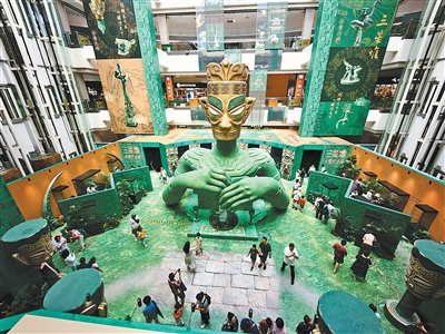 8月10日,观众在北京世纪金源购物中心参观三星堆古蜀艺术展。展览展出青铜神树、黄金面具、青铜大立人像、陶猪等40余件热门文物复制品,并设置10米高的青铜巨人装置供观众打卡。