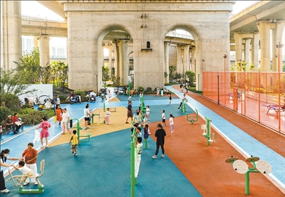 9月16日,安徽省芜湖市镜湖区,市民在长江三桥下的体育公园里休闲、健身。近年来,芜湖市积极推动城市更新,通过整合资源,对长江三桥下空间、边角地等闲置地块进行优化利用,为市民提供了休闲健身的好去处。