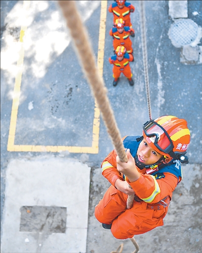 贵州省贵阳市南明区消防救援大队坚持从严从难设立训练目标,通过系统全面地开展体能、技能和战术等实战化课目训练,提升队伍应急救援综合能力。图为9月17日,南明区消防救援大队消防员开展绳索救援训练。