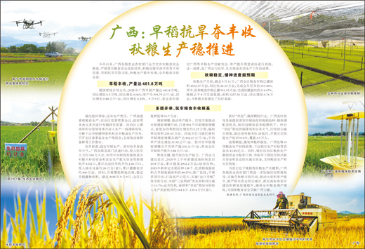 聚焦关键,提升综合生产能力。广西全力建设良田,2025年上半年新建成高标准农田29.8万亩,累计建成2902.2万亩;培育良种,2025年新审定水稻品种138个,优质稻栽插面积占早稻栽插面积的88.57%;推广良技,开展多项行动,打造高产示范片,实施“虫口夺粮”保丰收行动,水稻“三虫两病”发生面积同比减少13.7%;运用良机,春耕和“双抢”期间分别投入生产的农机具约164.5万、130.6万台(套)。