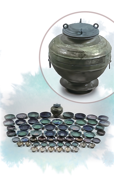 这件青铜罍出土于山东省淄博市临淄区的一处大型墓葬,其内部配置完备,包含耳杯、小碟、盘、盒等59件器物。其中,10件相同的耳杯用以饮酒盛羹,10件相同的小碟用以盛放醋、肉酱等蘸料,另有10件相同的圆形食盒,此外还有4个碗和25个盘子。结合配套的耳杯、小碟、食盒和当时的“分餐制”习俗推测,这套餐具大概率是为10人及以下规模的宴饮而设。