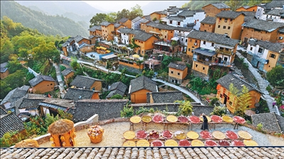 10月8日,安徽省黄山市歙县深渡镇阳产村,村民利用晴好天气晾晒红辣椒、玉米、南瓜等农作物。当地将晒秋民俗与土楼风貌结合起来,吸引游客前来欣赏秋色。