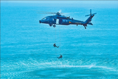 突击队员快速绳降入水。