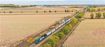 10月11日,一列编组50辆、满载3200余吨玉米的粮食专列从黑龙江省双鸭山市升昌站驶出,驶向辽宁省大连市。货物到达大连后将转运至上海、四川、云南等地。这是今年黑龙江省开行的首趟粮食集港图定直达货运班列,助力北粮南运。铁路部门后续将根据集货情况,组织多式联运班列、城际班列常态化、规模化开行,助力黑龙江优质农产品加速外运。