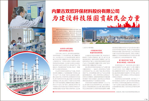 内蒙古双欣环保材料股份有限公司(简称“双欣环保”)于2009年6月成立。自成立以来,双欣环保不断加强科技创新和关键核心技术攻关,致力于成为全球绿色化工新材料领域的一流企业。双欣环保主营业务始终围绕培育新质生产力和推动高质量发展要求,强化科技创新赋能,推动企业绿色可持续发展。目前,双欣环保正依托聚乙烯醇全产业链布局,壮大经济新动能,努力为科技强国建设贡献力量。