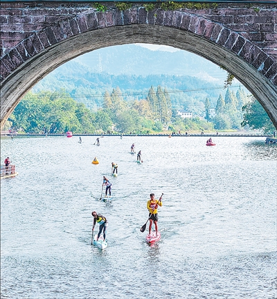 安徽黄山休宁县齐云山横江水域,参加2025年安徽省桨板公开赛的选手在挥桨竞逐。