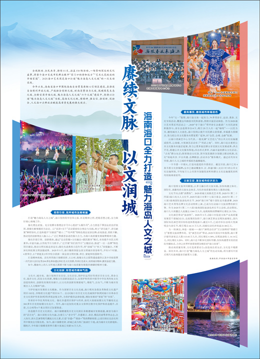 文化兴、城市亮。海口坚持历史自信、文化自信,保护好运用好传承好历史文化、革命文化、海洋文化、民俗文化资源,持续增强文化创新创造活力,在保护和传承中探寻中华优秀传统文化创造性转化、创新性发展的突破口,以文化的创新发展接地气、增底气、注生气,不断为城市发展注入人文精神气韵。