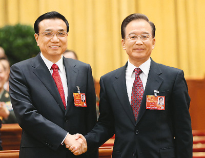 如潮的掌声中,国家主席习近平和李克强亲切握手。任期届满的温家宝和李克强亲切握手,相互致意。