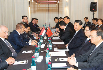 习近平表示,中方十分看重埃及作为阿拉伯、非洲、伊斯兰和发展中大国的地位和影响,珍视两国人民传统友谊。我们对埃及过渡进程取得的积极进展感到高兴,充分理解埃及目前面临的一些暂时性困难,中方愿继续向埃方提供力所能及的帮助。双方应该重点推进贸易、投资、人文等领域合作,搞好苏伊士经贸合作区项目。我们相信,埃及国家建设事业一定会取得新发展,中埃战略合作关系一定会取得新进展。