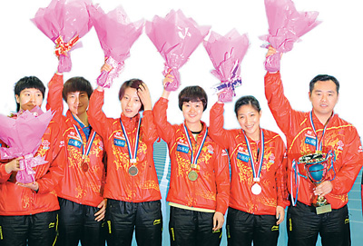 中国乒乓球女队在领奖台上。 新华社记者 卢汉欣摄