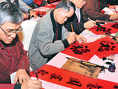 新年第一天,台北市举办汉字文化节,130位书法界以及台湾其他领域的人士会聚圆山大饭店,挥毫泼墨,写下对新年的祝福。图为台湾书法家在台北汉字文化节开笔仪式上挥毫。 |