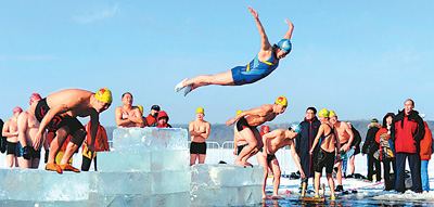 1月1日,2014中国沈阳国际冰雪节迎新年冬泳铁人三项赛在沈阳棋盘山冰雪大世界举行。辽宁省百余名冬泳爱好者通过冬泳、滑冰车、跑步三项比赛挑战严寒,快乐健身。 |