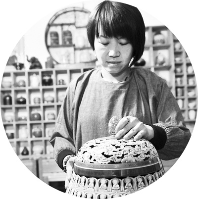 36岁的女陶艺家叶文怡来自台中,她专注于香炉的设计、制作,创新了数百种新款式的香炉、香具,并参与多次展览。如今,她的“香云赞”底款香道具在大陆已经成为业内的名品。图为叶文怡和她将赴法参展的作品。