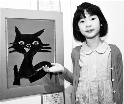 第五届海峡两岸少儿美术大展首展5月17日在台北艺术教育馆开幕。展览以“!”为主题,从两岸三地3万余件作品中,选出200余幅展出。图为台湾6岁的林育瑄在介绍自己的画作《可爱的黑猫》。