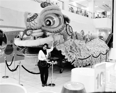 一名游客在百狮盛会现场与巨型舞狮合影。