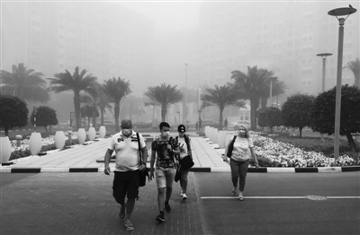 4月2日,在阿拉伯联合酋长国城市迪拜,人们戴着口罩走在沙尘暴中。 新华社/法新