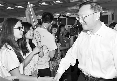 8月8日下午,当6名少男少女将以“海内外中华儿女一家亲”为主题的签名长卷交到国务委员杨洁篪手中时,人民大会堂里掌声雷动。杨洁篪充满笑意地接过长卷,将气氛引到高点,现场洋溢着浓浓的情意。