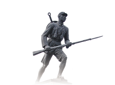 纪念碑上一位川军士兵,穿着短裤、绑着绑腿,背着斗笠大刀、手握步枪,胸前悬挂两颗手榴弹,注视前方,就像即将冲锋的战士。