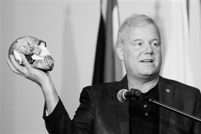 9月10日,在南非马加利斯堡,南非金山大学人类学教授李·伯杰展示新发现的原始人头骨化石的复制品。