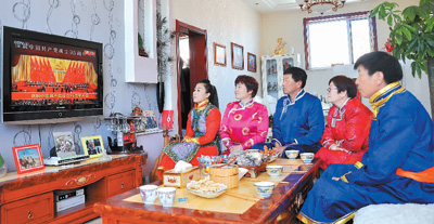 图为内蒙古乌拉特中旗巴音乌兰苏木伊和宝力格嘎查的牧民收看庆祝中国共产党成立95周年大会电视直播。