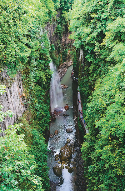 据说,地缝中共藏有7条半瀑布,地缝尽头是一条落差近百米的飞瀑,如白龙坠地直泻而下,最贴切的形容莫过于李白的诗云:飞流直下三千尺,疑是银河落九天。由于落差巨大,水沫在空气中形成一层薄如蝉翼的雾障,瞧着就像一件素色绸衣,细细的水雾珠飞溅到面颊上,凉彻心肺。