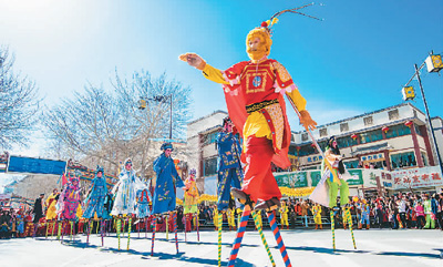 2月25日,中国农历正月初十,丝绸之路国际旅游名城甘肃敦煌迎来春节期间最热闹的一天。舞龙、耍狮、太平鼓、扭秧歌、跑旱船、踩高跷等各种形式的社火表演闹红了敦煌城。在当地标志性建筑“反弹琵琶”周围,精彩纷呈的社火表演吸引数万人走上街头围观,并一起庆贺即将到来的元宵佳节。图为敦煌社火中的孙悟空形象。