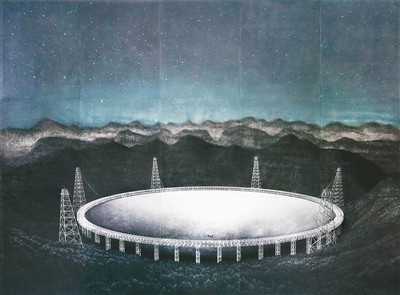 《中国“天眼”》 周吉荣 作品表现的是在贵州建成的世界最大单口径射电望远镜——500米口径球面射电望远镜。作品以凹版画的形式,表现了工程的精密与严谨,再现了这个“中国奇迹”。作品利用中国传统天文学中的星象、天象,对实物进行艺术化处理,以求达到科学题材与艺术表现的有机结合。作品中巨大的“天眼”被喀斯特地貌形成的独特山体、山脉层层环绕,群峦叠嶂,浩瀚天穹中的星辰与巨大的科技工程构成了天地和谐相融的景观。 |