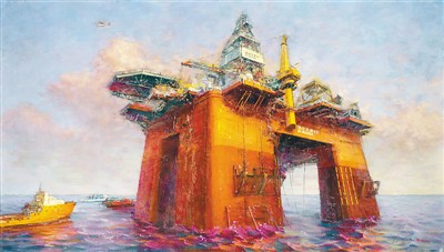 《重器——海洋石油981》 张振江 作品表现的是海洋石油981钻井平台。在我国众多特种船舶中,“海洋石油981”具有十分鲜明的形式特征——机械美、科技感和力量感。作品将主体物置于前景,采用仰视的视角,形成纪念碑式的构图,注重加强画面的透视感和空间感,表现了“海洋石油981”的威武雄姿。色调以红、蓝、紫为主色,渲染了神圣庄严的气氛。远处船舶游弋,空中直升飞机盘旋,与“海洋石油981”共同组成了为国奋战的壮丽景观。 |