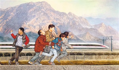 《高铁进山啦》 蔡 超 边 涛 李鸿莉 作品以“中国速度——高速铁路”为主题,表现山区的孩子们欢呼雀跃追逐高铁的场景。作品中孩子们在快乐地玩耍,孩子手中推动的铁环与高速行驶的列车形成强烈对比,突出高铁带来的幸福生活。 |