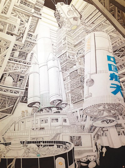 《飞天港》 王 利 作品表现了飞船发射前与舰船的组合、对接时工作人员紧张有序准备吊装工作的情景。为突出测试舰船和火箭飞船,构图采取仰视视角,使结构和设计看上去更真实。作品借鉴传统界画的艺术语言,将人物与航天器有机融合,用虚拟的真实贴切地表现出发射塔、飞船、空间站等器物的造型以及当代军人科研攻关、不懈奋斗的精神。 |