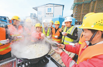 日前,中建五局安徽公司皖北分公司开展“冬至饺飘香、情暖工友心”迎冬至主题活动,在阜阳市城南新区一校园建设项目工地上,建筑工友们通过学习包饺子,为农民工建设者献上爱心饺子宴,在寒冬里送上温暖和祝福,喜迎“冬至”节气的到来。图为建筑工人一起品尝饺子。