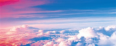 身下是茫茫云海,身边是万丈霞光,头上却是一碧如洗的蓝天。红彤彤的落日染红天边的云,远方灿烂的残霞流光溢彩,交织着橙黄、酡红、微紫、青黛的色泽。而天空却是蓝盈盈的,白云变换着各种形状,时而似高楼古堡,时而像棉絮锦缎,时而优雅若丝绸,时而汹涌如波涛。