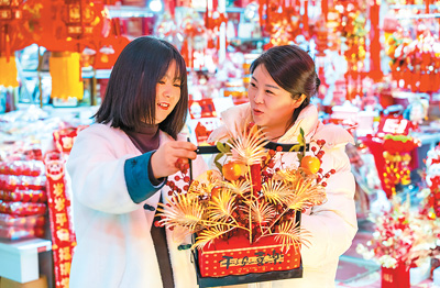 近日,陕西省西安市新城区举办年货展销会活动,食品、日用品、家居饰品以及手工艺品等年货种类丰富,吸引众多市民前来采购。图为市民在选购春节饰品。