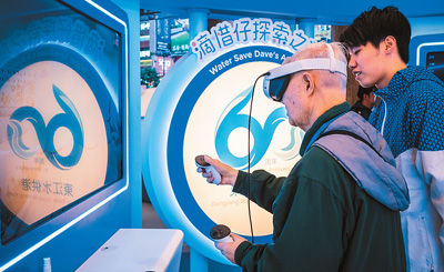 近日,在香港特区政府水务署于铜锣湾时代广场举办的“东江水供港60周年”专题巡回展上,参观者通过虚拟现实(VR)游戏体验“东江水供港”工程。